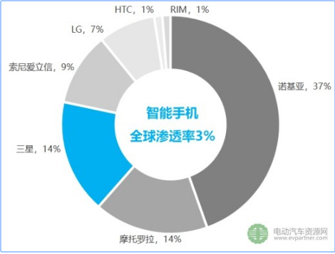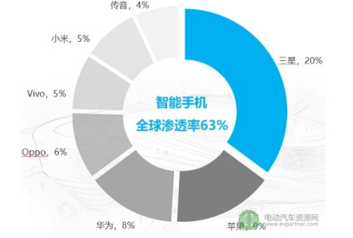 2007年,諾基亞等功能機(jī)在全球手機(jī)出貨量市場(chǎng)份額中占比高達(dá)83%;而2017年,昔日功能機(jī)品牌已僅存三星(智能化升級(jí));全球市場(chǎng)中,智能機(jī)已取代功能機(jī)主導(dǎo)地位,滲透率十年內(nèi)由3%躍升至63%。