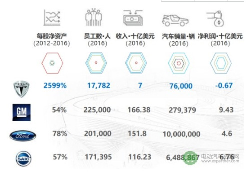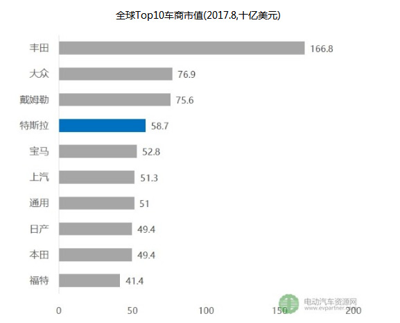 特斯拉(Tesla)2016年銷7.6萬(wàn)輛汽車,僅為福特的0.76%,哈弗H6在中國(guó)一個(gè)半月的銷量;2017年?duì)I收僅占比豐田的0.03%、通用的5%;市值卻一度躍升至全球No.4,其高市值表明市場(chǎng)對(duì)于電動(dòng)汽車的前景非常看好。