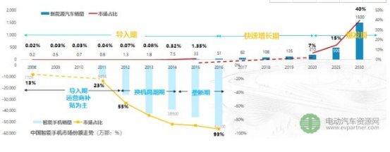 如同2012年之前智能手機(jī)尚處于導(dǎo)入期、隨后迎來(lái)?yè)Q機(jī)高潮期一樣,國(guó)內(nèi)新能源汽車行業(yè)目前已從導(dǎo)入及市場(chǎng)培育階段躍入快速增長(zhǎng)期。預(yù)計(jì)2020年其將迎來(lái)市場(chǎng)爆發(fā)期,隨后十年市場(chǎng)占有率有望從7%躍升至40%。在萬(wàn)物互聯(lián)的世界,純機(jī)械驅(qū)動(dòng)的傳統(tǒng)發(fā)動(dòng)機(jī)將像恐龍一樣滅絕。